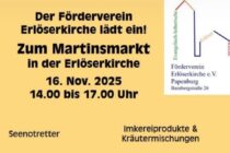 Wir beteiligen uns bereits seit vielen Jahren beim Martinsmarkt der Erlöserkiche. Auch in diesem Jahr haben wir die Einladung erhalten wieder dabei zu sein. So werden wir am 16. November von 14- 17 Uhr dort einen kleinen Stand aufbauen. Kommt also gerne vorbei, denn es gibt von der Kirchengemeinde eine tolle Tombula sowie Kaffee/Tee Weiterlesen