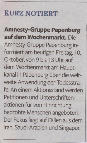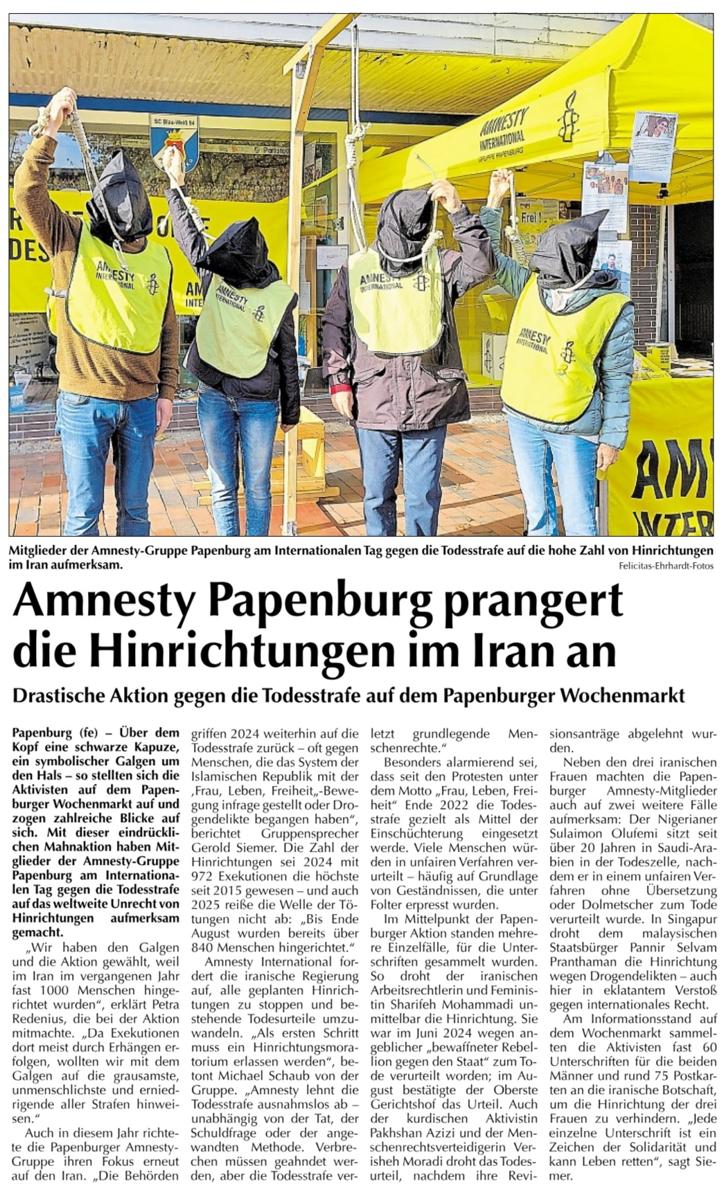 19.10.2025: Amnesty Papenburg prangert die Hinrichtungen im Iran an: EL-Kurier Papenburg