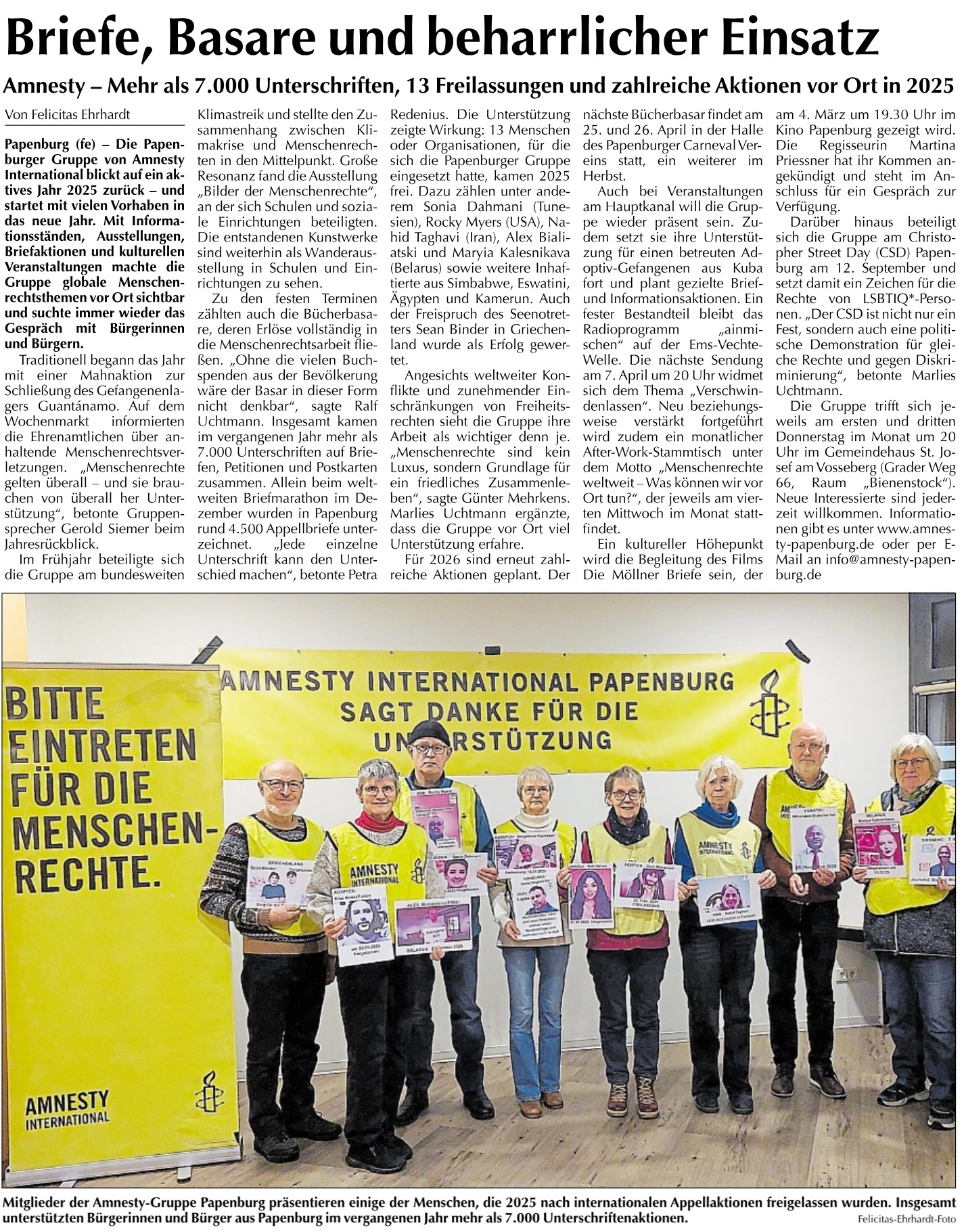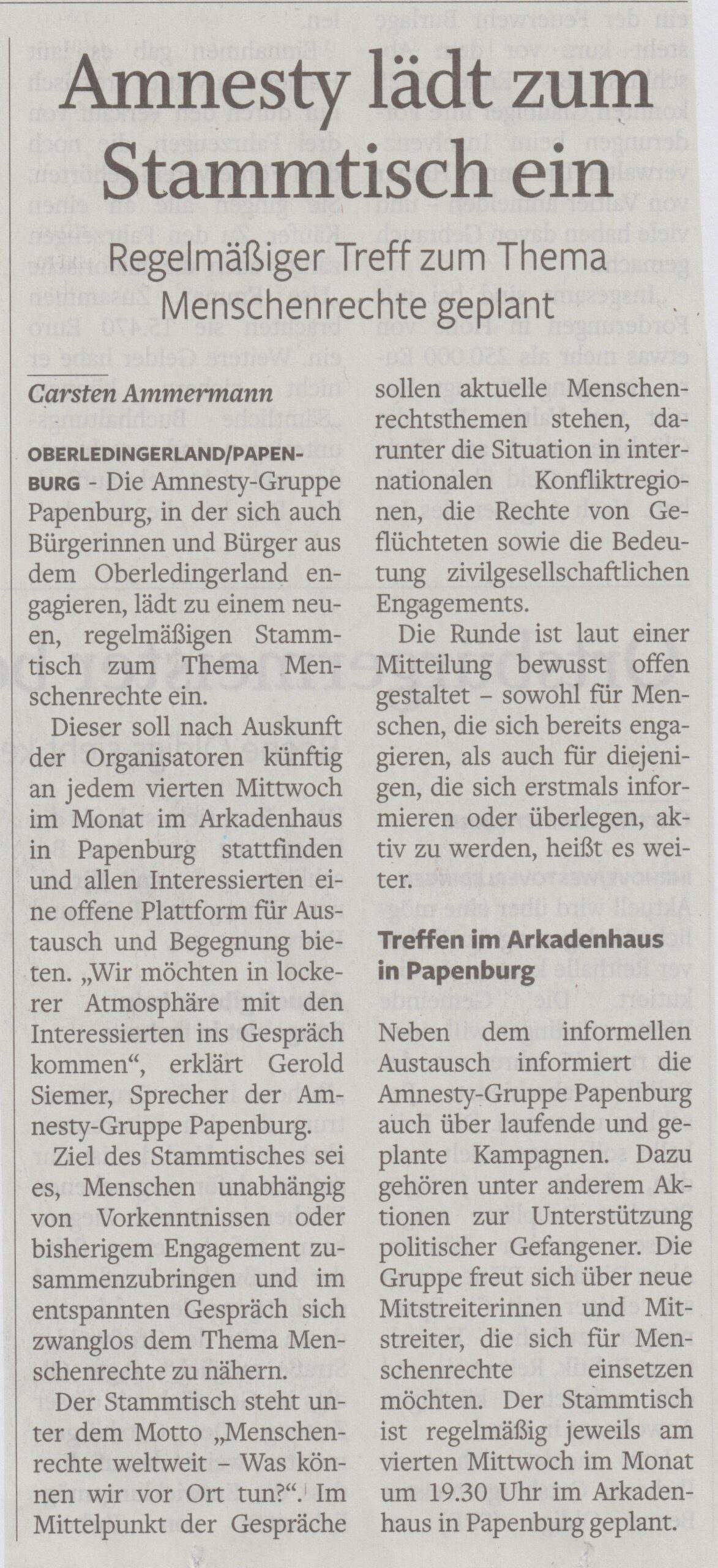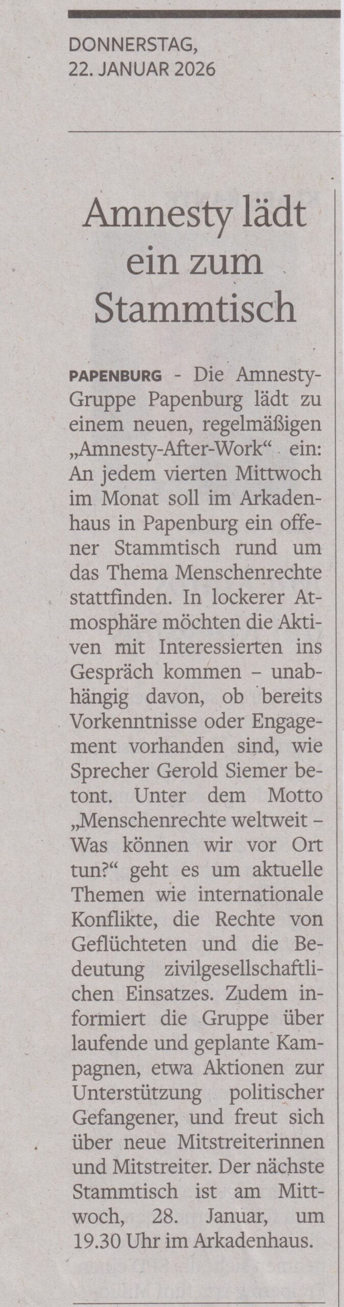 27.01.2026: Amnesty-Gruppe startet Stammtisch: Ems Zeitung