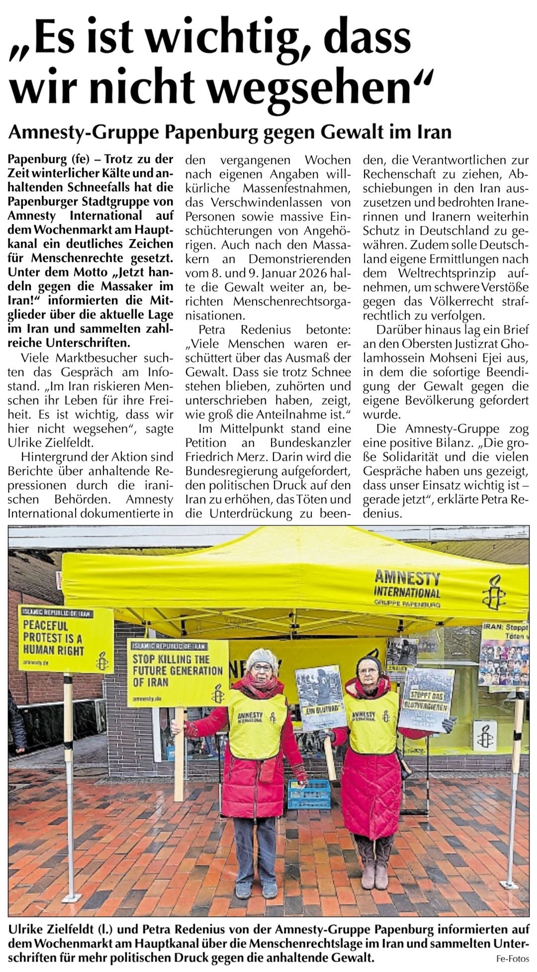 11.02.2026: Amnesty-Gruppe Papenburg mit Infostand zum Iran: Ems Zeitung