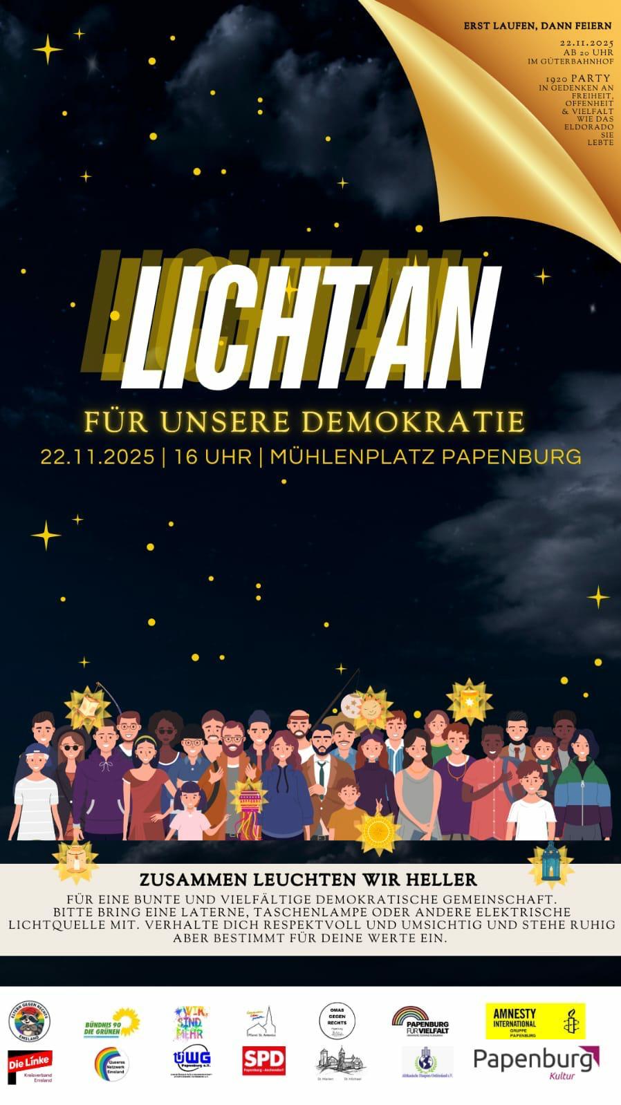 Ein breites Bündnis aus Mitgliedern von „Papenburg für Vielfalt“ lädt zu einem Lichterlauf am 22. November rund um den Hauptkanal ein.