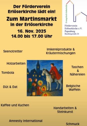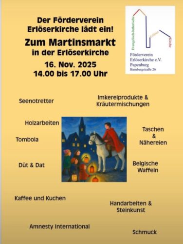 Wir beteiligen uns bereits seit vielen Jahren beim Martinsmarkt der Erlöserkiche. Auch in diesem Jahr haben wir die Einladung erhalten wieder dabei zu sein.